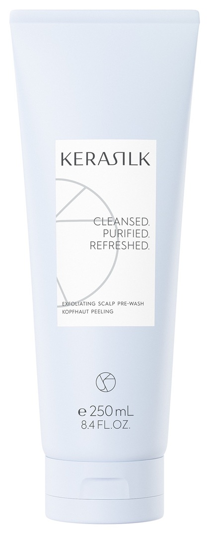 Das sanft tiefenreinigende Exfoliating Scalp Pre-Wash Peeling von Kerasilk mit Biomimetic Silk, Ectoin und Peelingkörnchen auf Jojoba-Basis reinigt die Poren, entfernt effektiv und sanft Verschmutzungen, abgestorbene Hautzellen und Öl und revitalisiert und erfrischt die Kopfhaut langanhaltend.