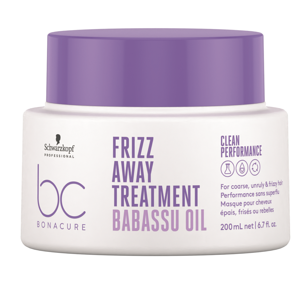 Das BonaCure Frizz Away Treatment von Schwarzkopf bändigt, pflegt und nährt schwer frisierbares, widerspenstiges, krauses und sprödes Haar intensiv, verleiht ihm Geschmeidigkeit und Glanz und schützt es dabei bis zu 72 Stunden vor Frizz und statischer Aufladung.